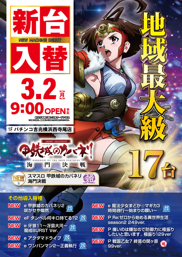 2026/02/28(土) 営業時間 9:00~23:00 (遊技終了は22:40です) ※貯玉される会員様の遊技終了は22:50となっております。