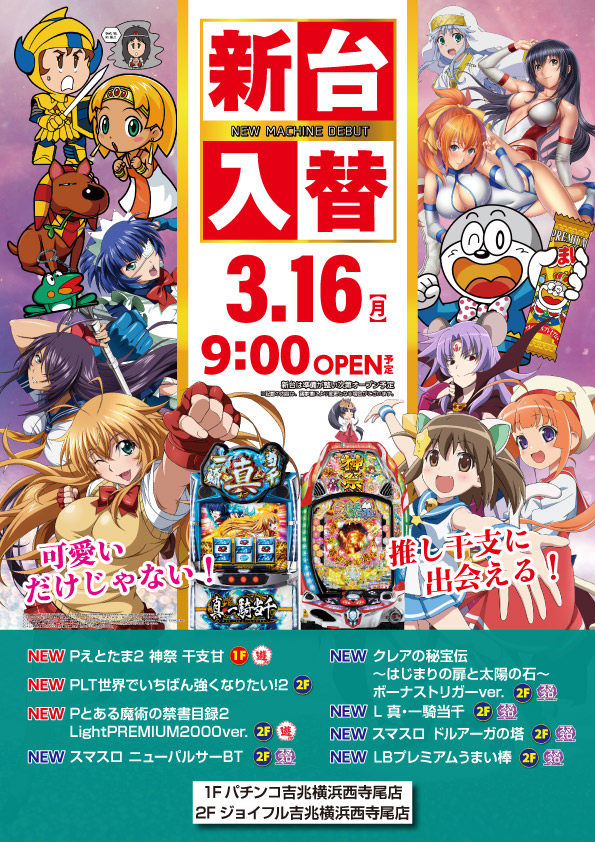 2026/03/14(土) 営業時間 9:00~23:00 (遊技終了は22:40です) ※貯玉される会員様の遊技終了は22:50となっております。